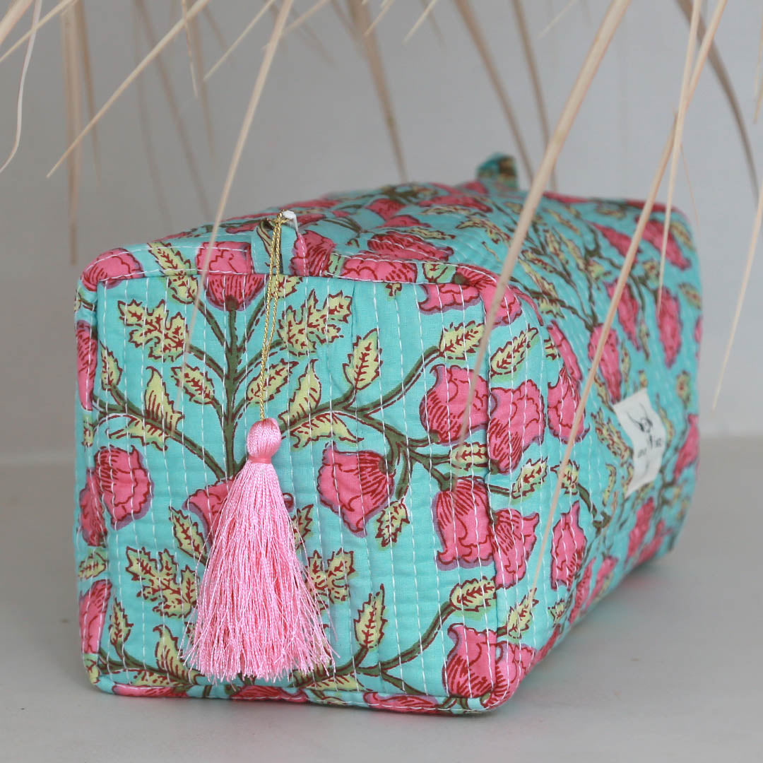 Blockprint Kulturbeutel Fez türkis Blume rosa M