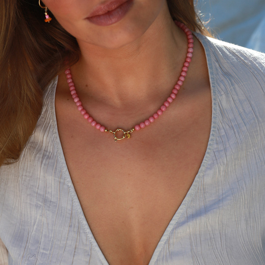 Ein echter Hingucker! Diese Halskette mit schimmernden korallenfarbenen Perlen verleiht jedem Look sofort einen trendigen, femininen Touch.