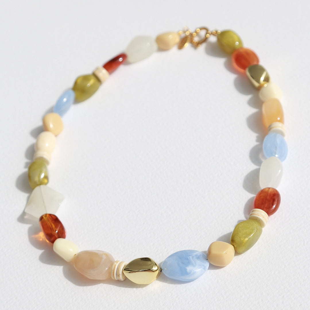 Die Halskette Sainte-Maxime ist ein verspielter Blickfang mit großen Acrylperlen in zarten Pastellfarben. Die unterschiedlichen Formen und Farbtöne sorgen für einen frischen, sommerlichen Look, während das leichte Material für angenehmen Tragekomfort sorgt. Perfekt, um jedem Outfit eine fröhliche und stilvolle Note zu verleihen.