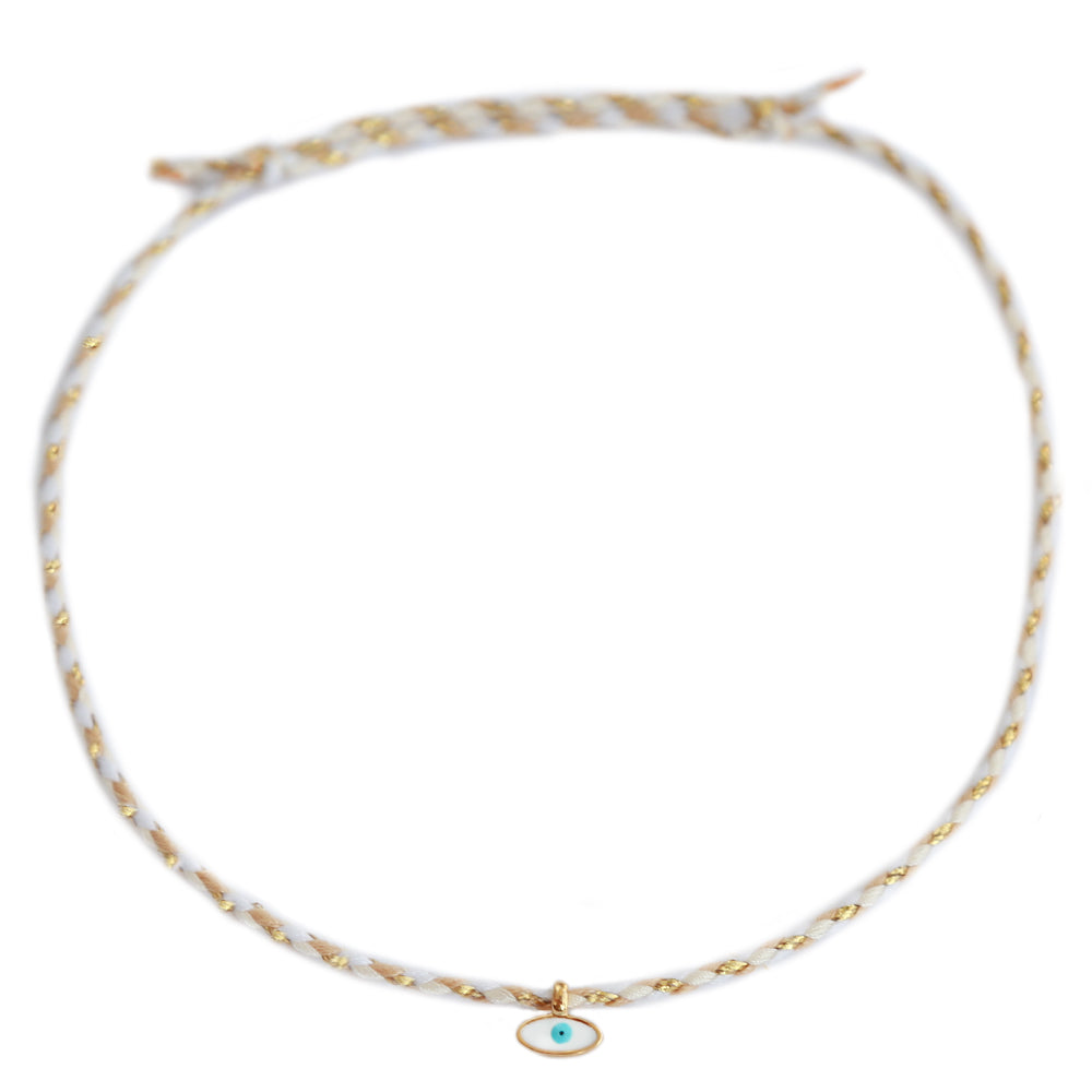 Fine anklet made of white and gold thread with a small gold evil charm.
