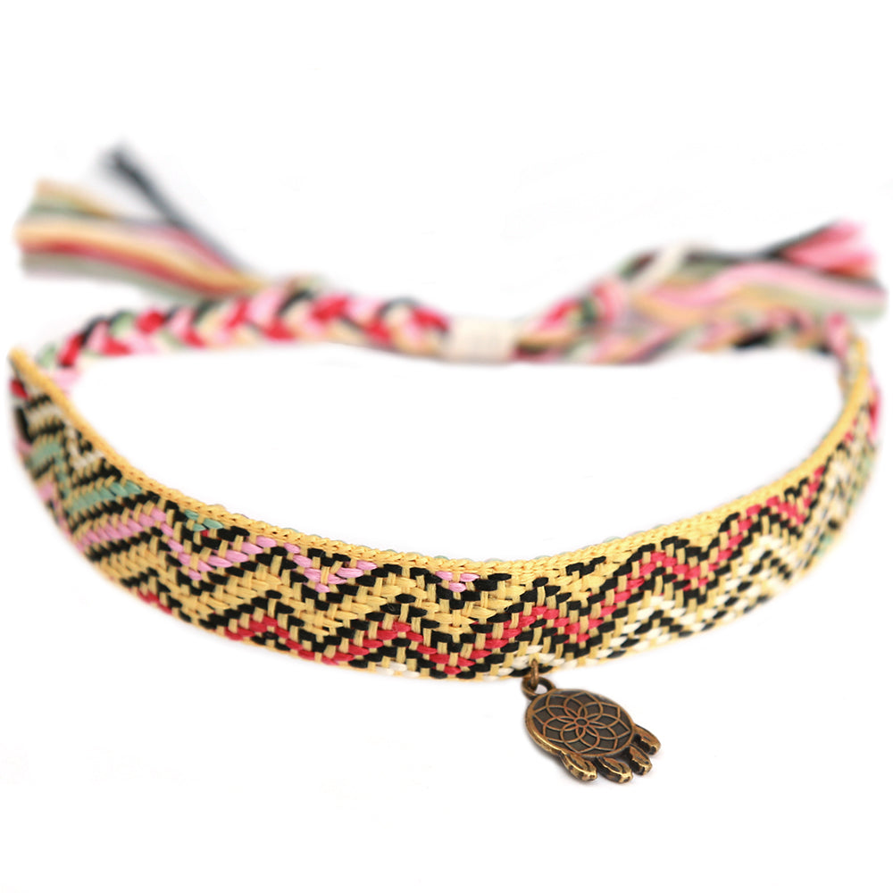 Nice woven colorful anklet with a bronze dream catcher pendant. Material: cotton, bronze plated.