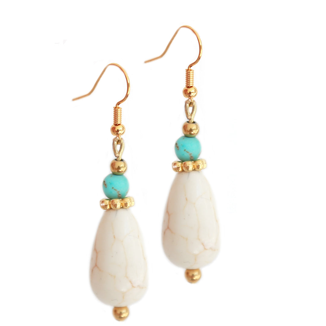 Nice handmade earrings with a cream natural stone in the shape of a drop.