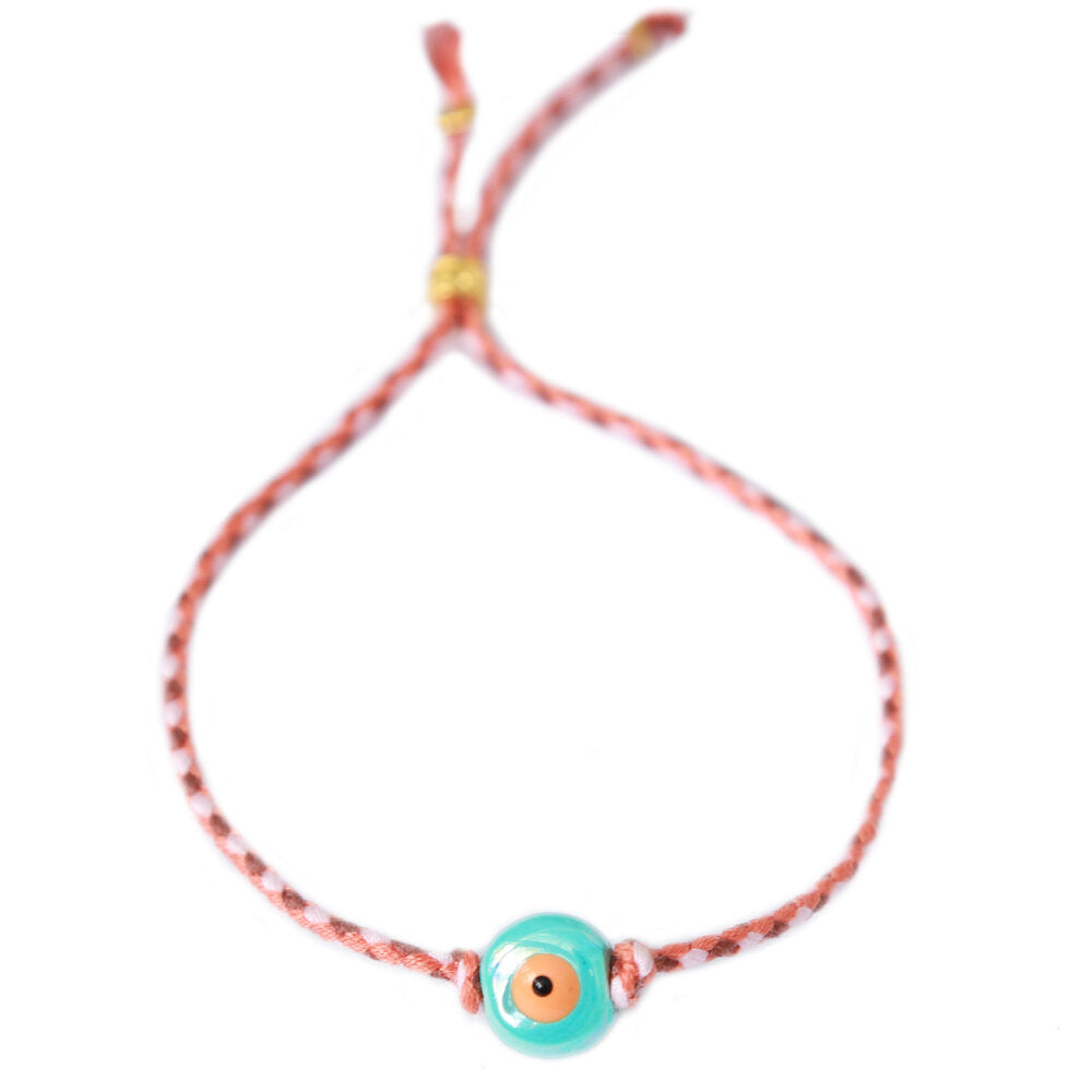 Fijn armbandje met een gekleurde keramieke bedel met een evil eye erop verwerkt.