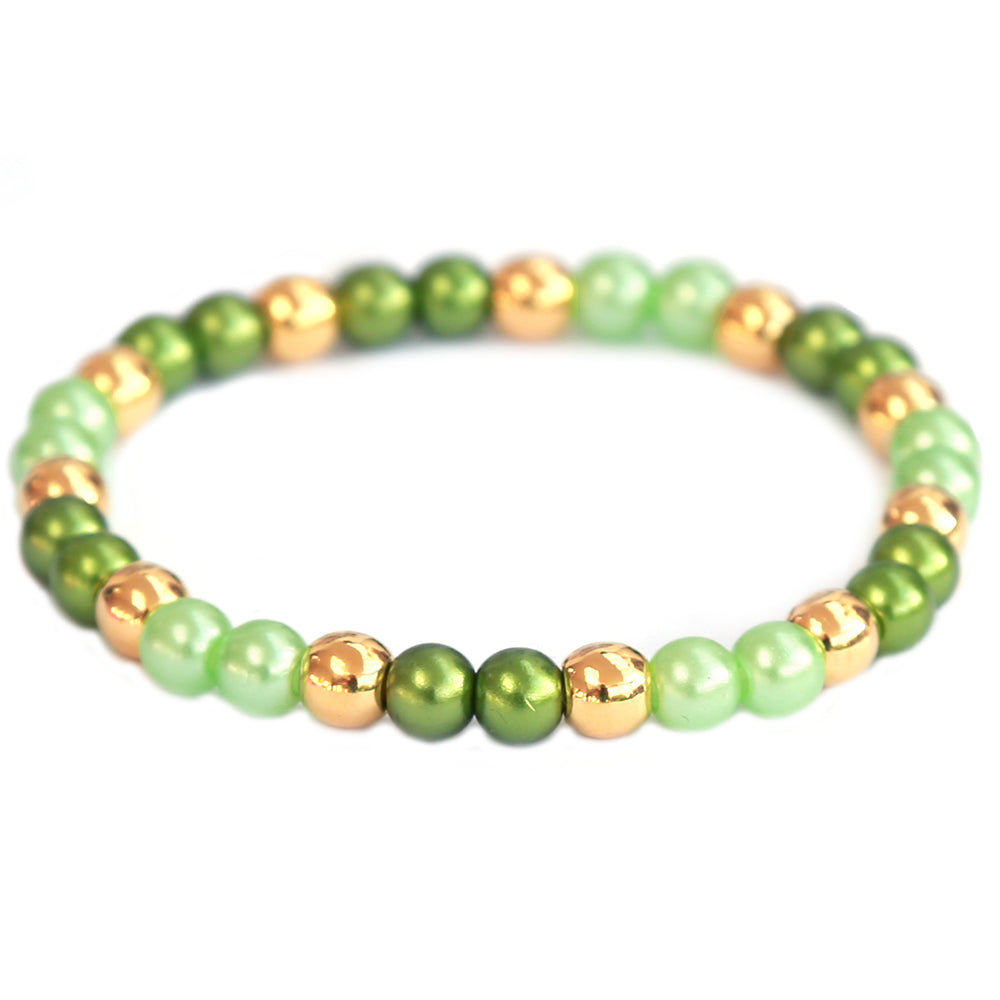 Leuk handgemaakt kralen armbandje in verschillende groene en gouden kralen! Het armbandje is gemaakt met elastiek.