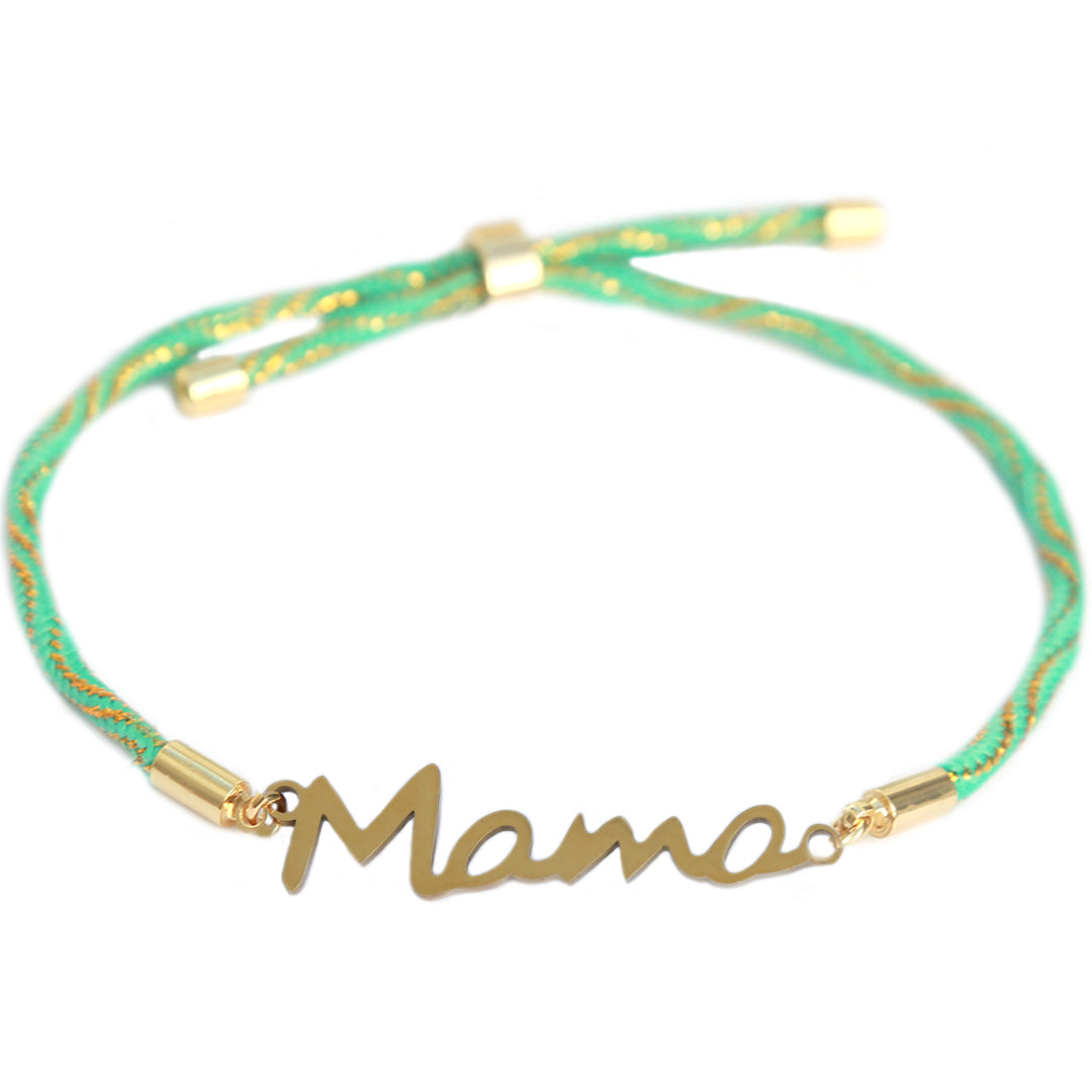 Mooi armbandje met een turquoise gekleurd koord en een gouden bedel met de letters 'mama'.