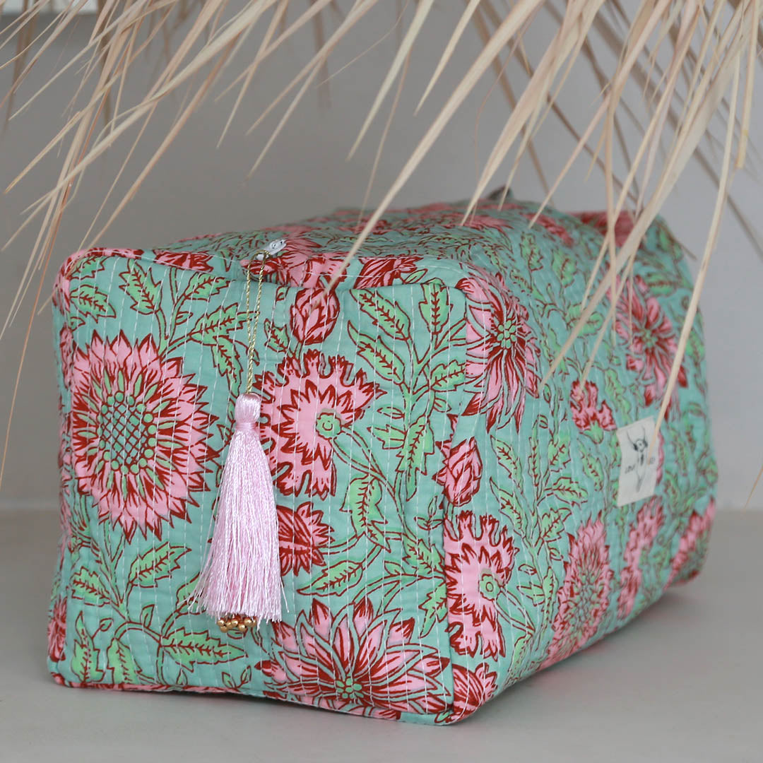In deze kleurrijke katoenen blockprint toilettas kun je al je toiletartikelen en makeup overal mee naartoe nemen....