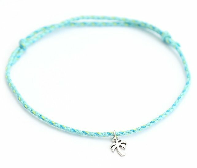 Mooi enkelbandje van turquoise gedraaid katoenen koord met een zilveren palm bedeltje.