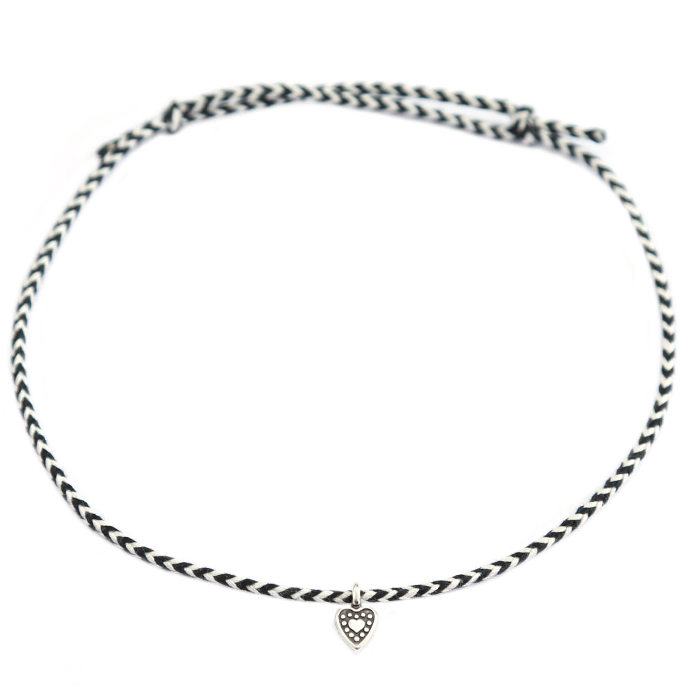 Mooi enkelbandje van zwart met wit gedraaid katoenen koord met een zilveren hartjes bedeltje.