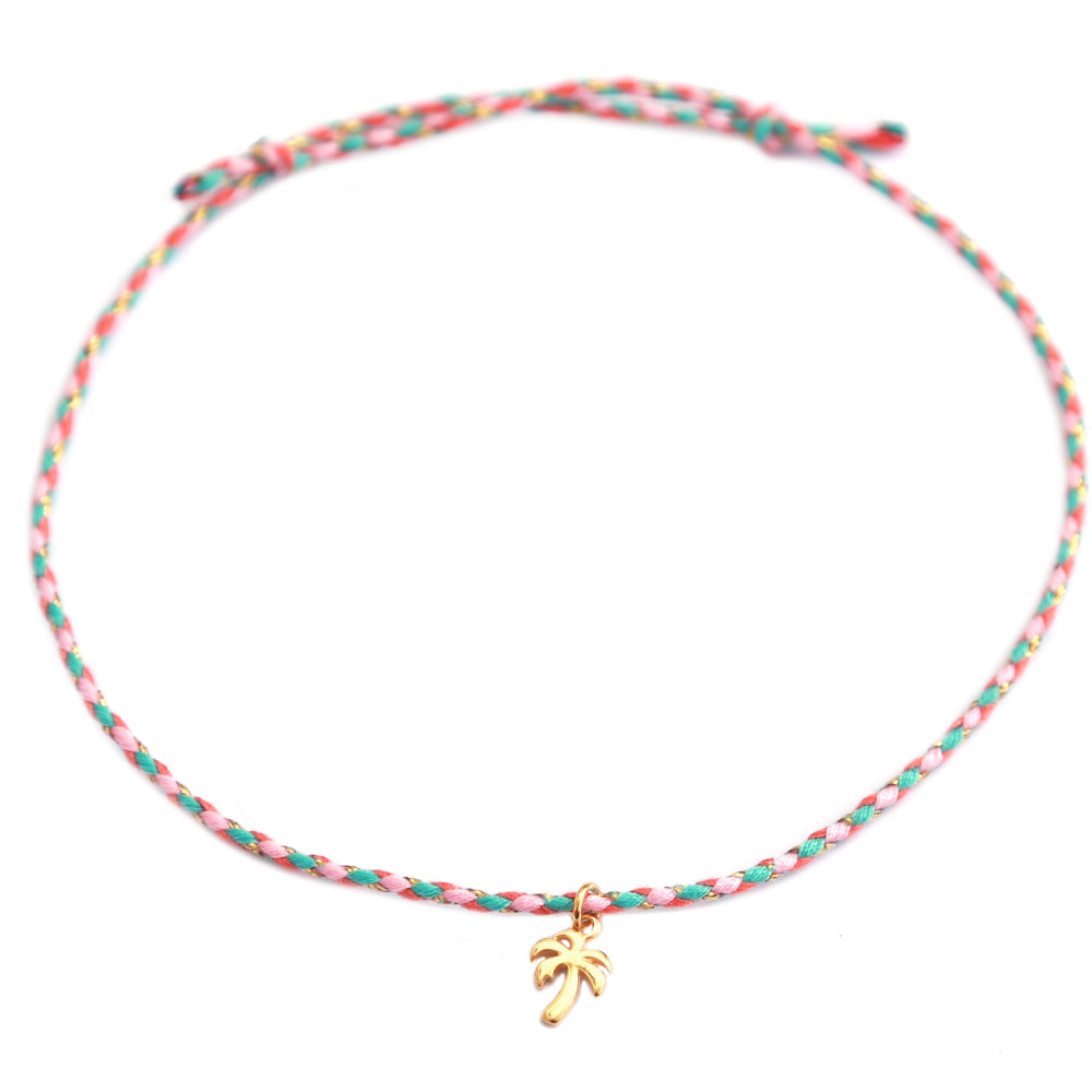 Mooi enkelbandje van gedraaid koord in zomerse kleurtjes en een gouden palm bedeltje.