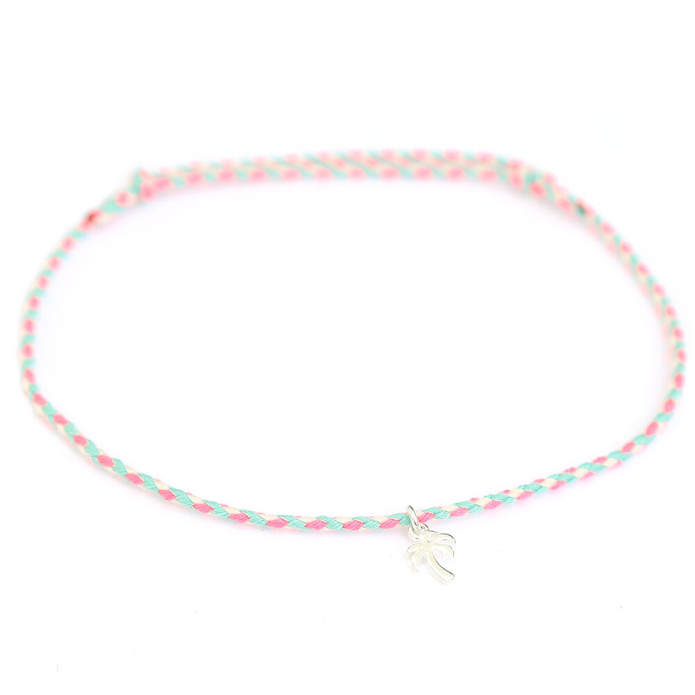 Mooi enkelbandje van turquoise, roze en wit gedraaid katoenen koord met een zilveren palm bedeltje.