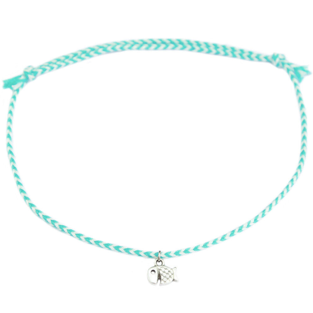 Fijn enkelbandje van wit en mint kleurig draad met een klein zilveren vissen bedeltje.