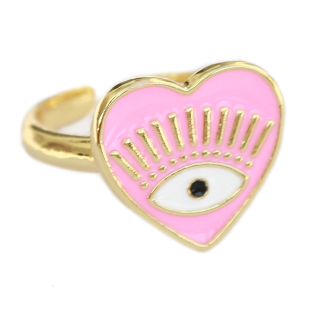 Leuke gouden ring met een groot roze hartje en een evil eye.