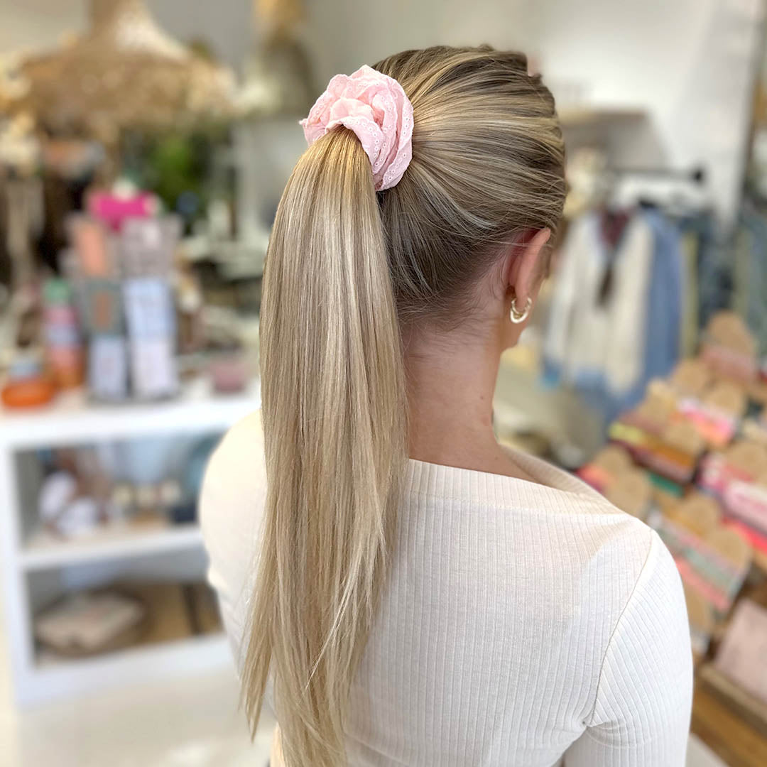 Met deze roze broderie scrunchie zorg je ervoor dat je staart of knot een leuke twist krijgt! Naast dat de scrunchie geweldig is voor in je haar, staat hij ook nog eens leuk om je pols.