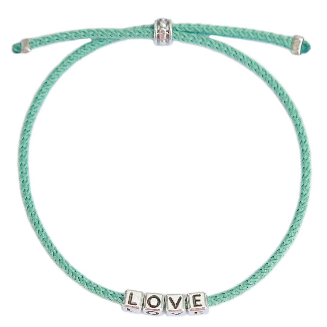 Leuk handgemaakt armbandje met zilveren LOVE bedeltjes en turquoise koord.